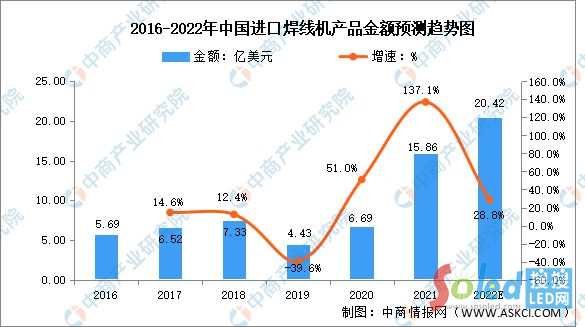 數(shù)據(jù)顯示,全球焊線機(jī)市場規(guī)?傮w增長穩(wěn)定,由2016年的7.92億美元增長至2021年的21.6億美元,復(fù)合年均增長率為22.22%。中商產(chǎn)業(yè)研究院預(yù)測,2022年全球焊線機(jī)市場規(guī)模將達(dá)21.95億美元。