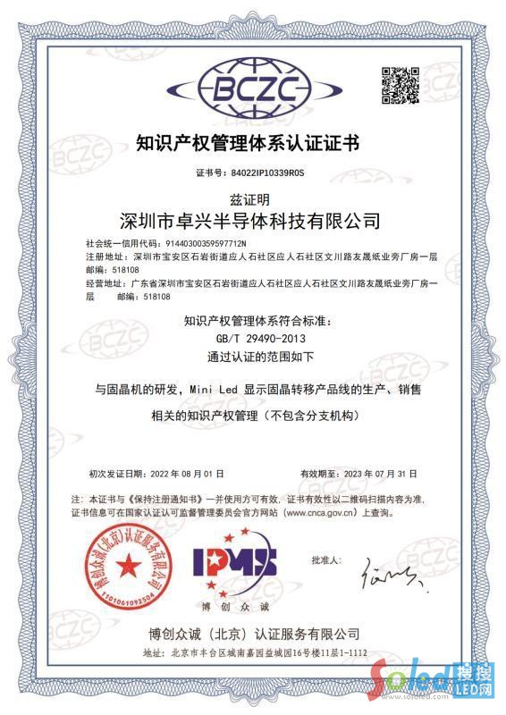 卓興不僅有研發(fā),更有體系。為了更加規(guī)范,更加可持續(xù)的為LED行業(yè)提供技術(shù)創(chuàng)新能力與成果轉(zhuǎn)化能力,卓興半導(dǎo)體申報(bào)并通過了《企業(yè)知識(shí)產(chǎn)權(quán)管理規(guī)范》(GB/T 29490-2013)標(biāo)準(zhǔn)審核認(rèn)證,并獲得了國家知識(shí)產(chǎn)權(quán)局頒發(fā)的《知識(shí)產(chǎn)權(quán)管理體系認(rèn)證證書》。這意味著卓興半導(dǎo)體在知識(shí)產(chǎn)權(quán)管理體系、企業(yè)綜合競爭力等方面將獲得更高的規(guī)范及提升,標(biāo)志著企業(yè)知識(shí)產(chǎn)權(quán)管理進(jìn)入全新階段,從此在知識(shí)產(chǎn)權(quán)規(guī)范化管理、創(chuàng)造、運(yùn)用和保護(hù)方面全面邁入國內(nèi)領(lǐng)先水平。