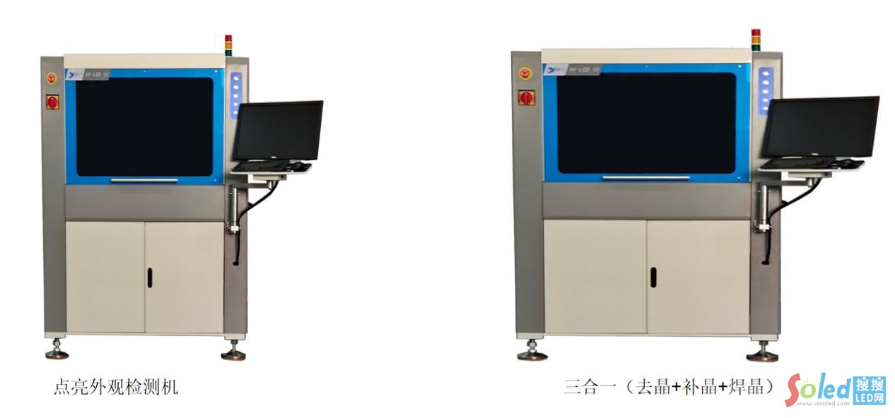 由在線點亮外觀檢測機、在線晶圓去除機、在粘錫固晶機、在線激光焊晶機等主要設(shè)備組成。在線外觀檢測機對晶圓進行光學(xué)檢測和點亮檢測后,將檢測不良晶圓坐標(biāo)信息存儲并傳到下位機,再由在線晶圓去除機去除不良晶圓,不良晶圓去除后在進行粘錫及晶圓補齊固晶,最后在線激光焊晶機激光精準(zhǔn)對晶圓進行焊接。此方案可對Mini LED直顯進行全自動修補,檢修后焊點完美、焊盤完整。