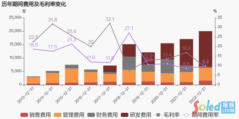 公司2022年營業(yè)成本18.44億元,同比增長10.4%,高于營業(yè)收入1%的增速,導致毛利率下降7.8%。期間費用率為9.9%,較上年升高1.4%。