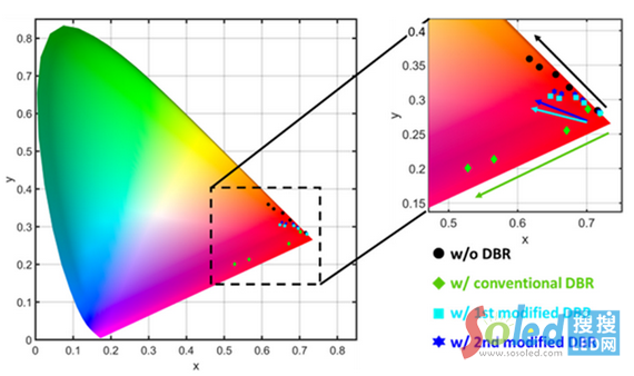圖二、結(jié)合不同DBR的InGaN紅色Micro LED的CIE 1931色彩坐標(biāo)