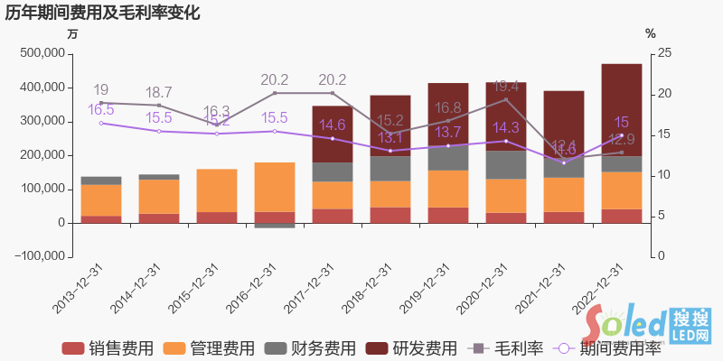 公司2022年?duì)I業(yè)成本273.9億元,同比下降7.7%,高于營業(yè)收入6.9%的下降速度,毛利率上升0.8%。期間費(fèi)用率為15%,較上年升高3.4%。