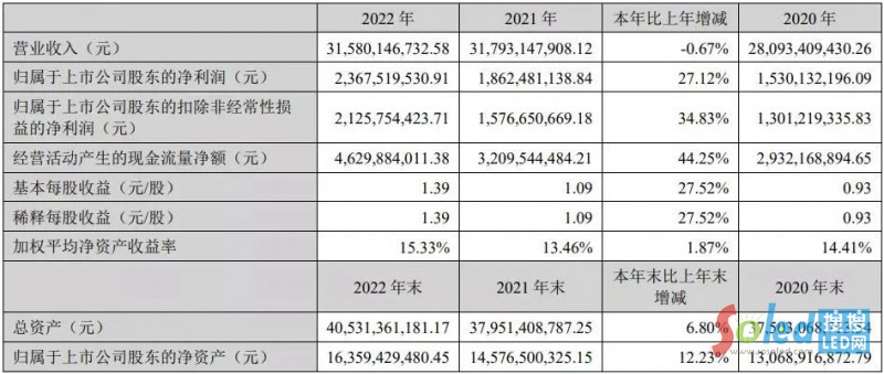 東山精密東山精密(SZ 002384)4月20日晚間發(fā)布年度業(yè)績報告稱,2022年營業(yè)收入約315.8億元,同比減少0.67%;歸屬于上市公司股東的凈利潤約23.68億元,同比增加27.12%;基本每股收益1.39元,同比增加27.52%。
