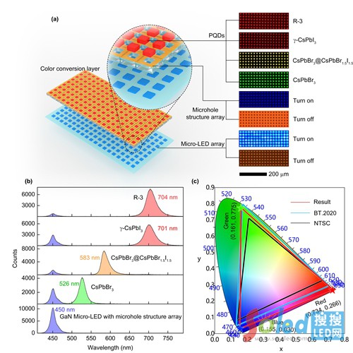 在將紅光量子點(diǎn)最佳激發(fā)波長調(diào)節(jié)至藍(lán)光區(qū)域后,研究人員將該雙組分量子點(diǎn)應(yīng)用于藍(lán)光Micro LED色轉(zhuǎn)換層中。借助玻璃微孔陣列作為載體,沉積出的量子點(diǎn)陣列與Micro LED陣列相對應(yīng),實(shí)現(xiàn)了極佳的色轉(zhuǎn)換性能,顯示色域可達(dá)到135.9%的NTSC標(biāo)準(zhǔn)。