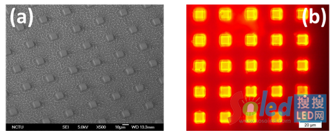 Fig. 2. (a)于掃描式電子顯微鏡(SEM)之下的各個像素。(b)填裝量子點之后的像素置于紫外線熒光顯微鏡之下 [3]。