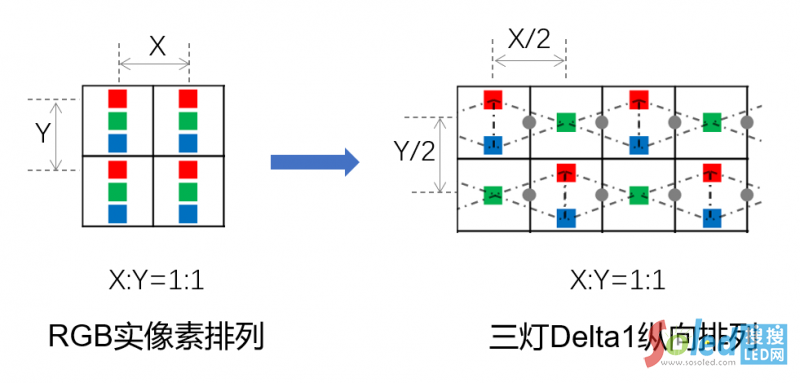 如上左圖,實像素排列中,每個黑色框內(nèi)的RGB三個子像素組成一個完整像素進(jìn)行內(nèi)容顯示。