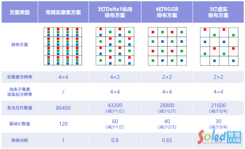 以常見的P0.9 COB燈板為例,對比以下四種方案的發(fā)光芯片及驅(qū)動IC數(shù)量情況: