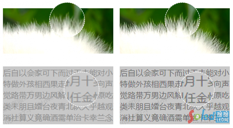 如上右圖,以四燈RGGB排列為例,每個黑色框內(nèi)只有一個子像素,通過先進(jìn)的動態(tài)子像素渲染技術(shù),可根據(jù)圖像內(nèi)容靈活借調(diào)周邊子像素,使得1個子像素可以實現(xiàn)完整的像素內(nèi)容顯示。對比實像素,在四燈RGGB排列時,每個(RGB)像素只增加一個子像素(G)的情況下,可以實現(xiàn)4倍增的顯示效果。