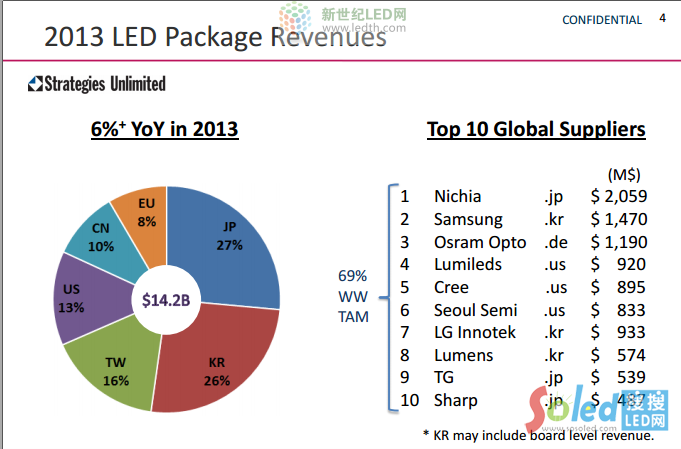 在廣州國際照明展同期舉辦的論壇上,《LED照明世界》聆聽了晶元光電協(xié)理林依達(dá)做的一個關(guān)于《全球LED產(chǎn)業(yè)現(xiàn)狀與展望》的演講報告,可以說這是一個非常有內(nèi)容的市場報告。如上圖所示,是全球封裝的一個最新調(diào)查數(shù)據(jù)。從封裝的角度來解讀全球整個LED市場的態(tài)勢,2013年,全球整個封裝的營收同比增長大概是6%,這6%是包含所有的一個應(yīng)用。國內(nèi)所占份額有所上升,2012大概是7-8%,去年上升到10%。報告還提到了營業(yè)額前十的廠商,所占全球市場份額達(dá)69%,日亞化學(xué)最高,達(dá)20.59億美金,三星次之,歐司朗排名第三。而晶元光電大概占據(jù)7億美金。
