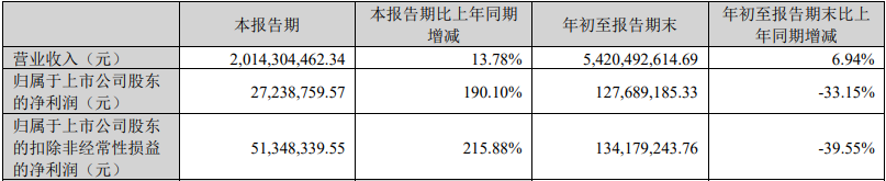 10月20日晚間,公司披露的三季報(bào)顯示,報(bào)告期,公司實(shí)現(xiàn)營(yíng)業(yè)收入54.20億元,同比增長(zhǎng)6.94%;實(shí)現(xiàn)歸屬于上市公司股東的凈利潤(rùn)1.28億元,同比下滑33.15%。
