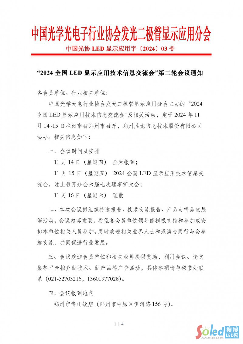 中國光學光電行業(yè)協(xié)會發(fā)光二極管顯示應用分會主辦的“2024全國LED顯示應用技術信息交流會”及相關活動,定于2024年11月14~15日在河南省鄭州市召開,鄭州勝龍信息技術股份有限公司協(xié)辦。