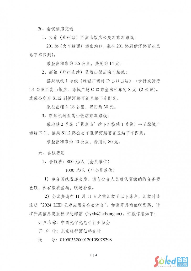 2)會議費請在11月11日之前匯款至以下賬戶,匯款時請注明“2024 LED顯示應用分會交流會”。如需開具增值稅發(fā)票,請將開票信息發(fā)至秘書處郵箱(hyxh@leds.org.cn)。匯款信息如下: