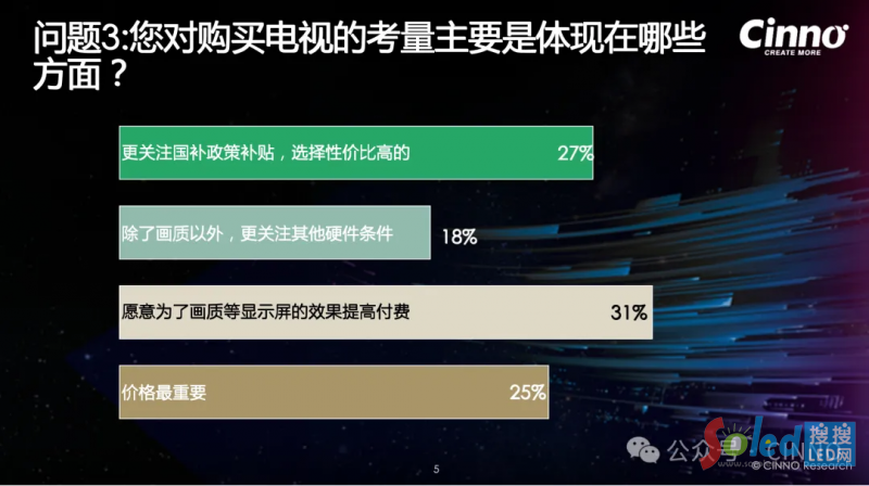在會前關(guān)于Mini LED電視的問卷調(diào)查中,絕大多數(shù)受訪者家中尚未擁有Mini LED電視,但對未來更換電視時考慮該技術(shù)的意愿較高。調(diào)查顯示,消費(fèi)者在購買電視時,最關(guān)注硬件性能和畫質(zhì),尤其是對Mini LED電視在亮度、對比度及畫質(zhì)上的提升感知最為強(qiáng)烈。關(guān)于價(jià)格區(qū)間,超過半數(shù)受訪者傾向于3000至6000元的中高端Mini LED電視。同時,外觀設(shè)計(jì)和應(yīng)用場景的多樣化是最能直觀感受到的變化,但精準(zhǔn)控光和畫質(zhì)提升較難察覺。價(jià)格被認(rèn)為是影響Mini LED電視普及的主要因素。