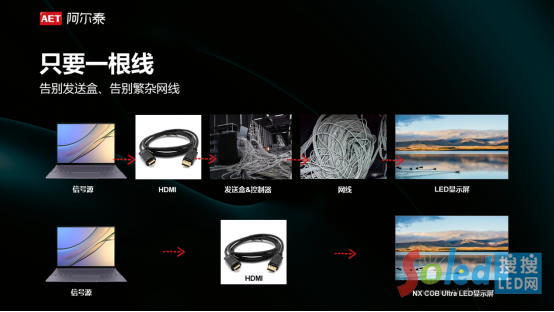 這一技術(shù)直接讓COB產(chǎn)品有了由外而內(nèi)的重大革新:告別了發(fā)送盒和繁雜的網(wǎng)線,信號源與LED大屏只需一根HDMI線連接,即插即用;簡化傳輸架構(gòu),可實現(xiàn)信號源與顯示器之間真正“零延遲”。