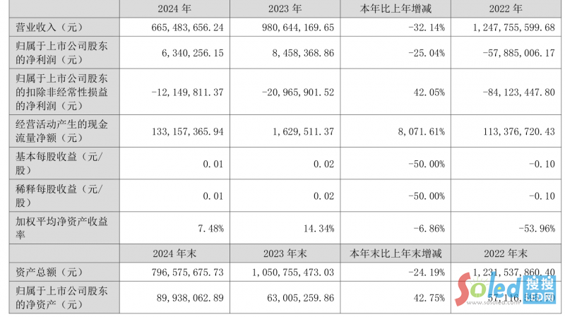 聯(lián)建光電(300269)4月16日披露2024年年度報(bào)告。2024年,公司實(shí)現(xiàn)營(yíng)業(yè)總收入6.65億元,同比下降32.14%;歸母凈利潤(rùn)634.03萬元,同比下降25.04%;扣非凈利潤(rùn)虧損1214.98萬元,上年同期虧損2096.59萬元;經(jīng)營(yíng)活動(dòng)產(chǎn)生的現(xiàn)金流量?jī)纛~為1.33億元,同比增長(zhǎng)8071.61%;報(bào)告期內(nèi),聯(lián)建光電基本每股收益為0.01元,加權(quán)平均凈資產(chǎn)收益率為7.48%。