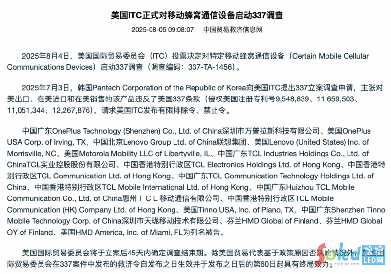 當地時間8月4日,美國國際貿易委員會(ITC)正式投票決定對“特定移動蜂窩通信設備”啟動337調查(調查編碼:337-TA-1456)。中國TCL、一加、聯(lián)想等多家企業(yè)及其海外關聯(lián)公司,以及芬蘭HMD Global等企業(yè)被列為列名被告,卷入此次知識產權糾紛。