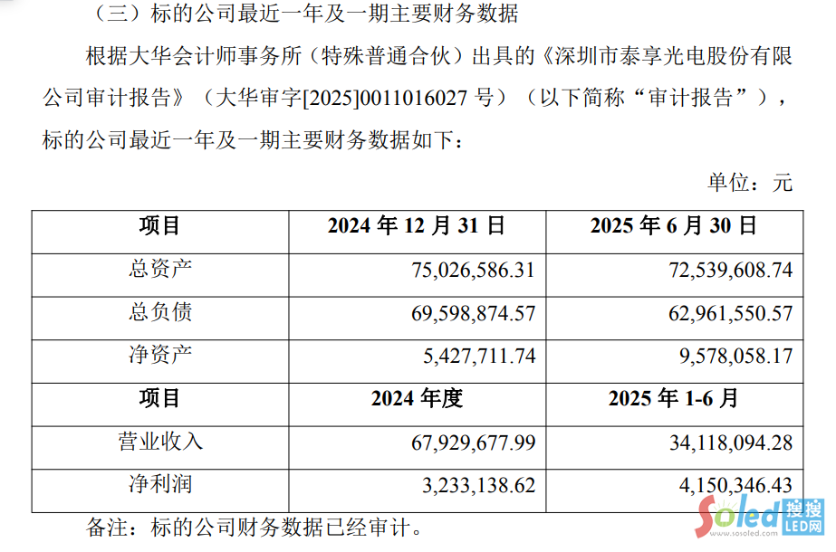 估值方面,評(píng)估機(jī)構(gòu)對(duì)泰亨光電全部資產(chǎn)及負(fù)債進(jìn)行了評(píng)估,截至評(píng)估基準(zhǔn)日2025年6月30日,在持續(xù)經(jīng)營條件下,泰亨光電申報(bào)的總資產(chǎn)賬面價(jià)值7,253.96萬元,總負(fù)債賬面價(jià)值6,296.16萬元,凈資產(chǎn)賬面價(jià)值957.81萬元。經(jīng)收益法評(píng)估,泰亨光電股東全部權(quán)益價(jià)值為2,787.00萬元,評(píng)估增值1,829.19萬元,增值率190.98%。