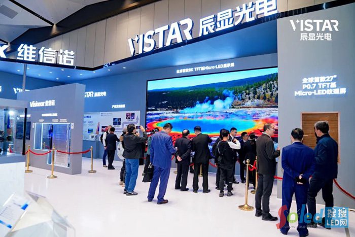 其中,辰顯光電展出的全球首款8K TFT基 Micro-LED顯示屏,憑借270英寸超大尺寸與極致畫質,成為全場焦點,代表了當前全球顯示技術的最高水平。其像素間距僅0.7毫米,8K 超高清分辨率可呈現(xiàn)超3300萬個像素點的細膩細節(jié),畫面細膩通透。產品采用先進的AM驅動技術,實現(xiàn)每個像素獨立控制,畫面更加均勻穩(wěn)定,徹底解決傳統(tǒng)LED大屏亮暗不一的問題。得益于 Micro-LED 自發(fā)光特性,屏幕可呈現(xiàn)純粹的黑色、極高的對比度和自然鮮艷的色彩,帶來如臨其境的觀影體驗?蓮V泛應用于專業(yè)影院、高端私人影院、指揮調度中心、商業(yè)展示等高端場景。