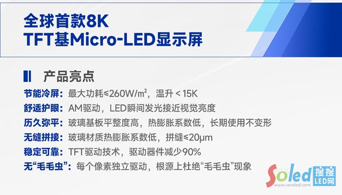 全球首款13.55英寸 P0.7 TFT基Micro-LED拼接模組:模塊化大尺寸設計,平整度高、拼縫小,為超高清商顯提供可規(guī);墓こ袒桨。