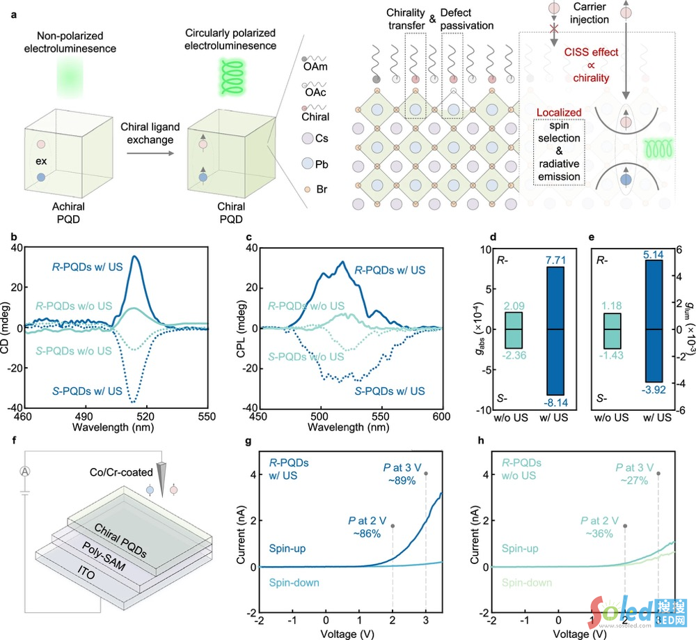 在這種機制下,手性鈣鈦礦量子點利用手性誘導自旋選擇性(CISS, chiral-induced spin selectivity)效應,高效地篩選出特定自旋方向的載流子。更關鍵的是,一旦這些自旋極化的載流子進入量子點,由于量子點的強限域作用,它們會迅速復合發(fā)光,沒有時間去發(fā)生自旋弛豫。