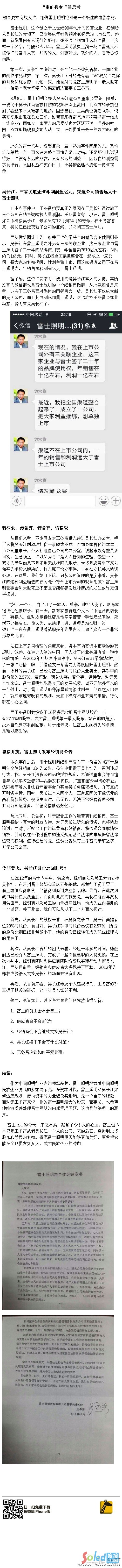 “雷府兵變”當(dāng)思考——如果要拍商戰(zhàn)大片,相信雷士照明絕對(duì)是一個(gè)極佳的電影素材。還是那句老話說(shuō)得好:“沒(méi)有永遠(yuǎn)的朋友,只有永遠(yuǎn)的利益”,因各自的利益需求而結(jié)合,又因利益沖突而反目,王吳依然逃不脫這一商業(yè)宿命。益沖突而反目,王吳依然逃不脫這一商業(yè)宿命。