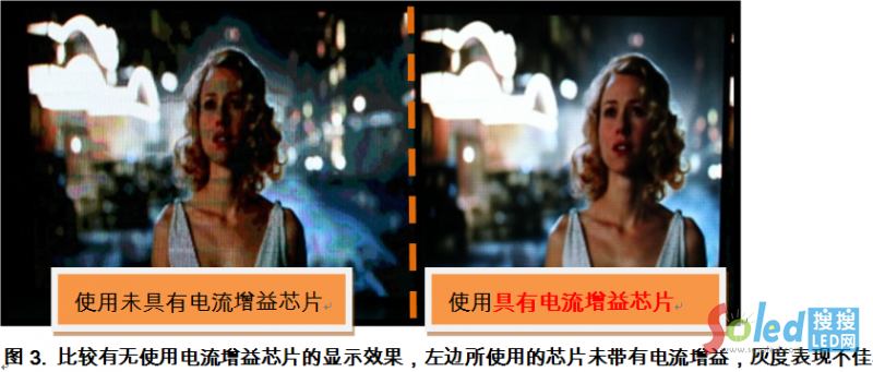 當顯示屏走進室內(nèi)使用時,亮度成為關(guān)鍵。使用通用型驅(qū)動芯片,透過控制器數(shù)字方式調(diào)節(jié)亮度,不論是否顯示高灰階數(shù)據(jù)或是降低利用率,都會造成灰階損失。聚積科技提出的解決方案是,使用具有電流增益調(diào)整的驅(qū)動芯片才能動態(tài)調(diào)整亮度且不損失性能。聚積具電流增益的芯片,將可以動態(tài)調(diào)整亮度自12.5%-200%,針對室內(nèi)常使用的低亮狀態(tài)(<300 nits),不會損失灰階且畫面依舊完美呈現(xiàn)。