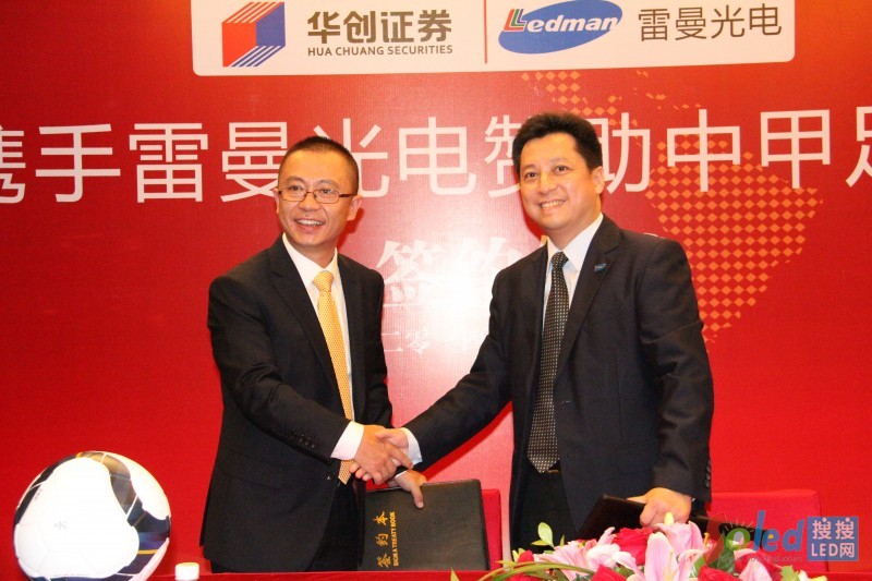 2014年10月26 日,“華創(chuàng)證券攜手雷曼光電贊助中甲足球聯(lián)賽俱樂部”簽約儀式在深圳威尼斯酒店舉行,華創(chuàng)證券成為雷曼在體育商務(wù)開發(fā)領(lǐng)域第一個重量級合作伙伴,此舉也標(biāo)志著雷曼正式開啟了中甲足球聯(lián)賽商務(wù)權(quán)益銷售。雷曼光電董事長李漫鐵和華創(chuàng)證券總裁吳亞秋均表示此次簽約意義重大,是雙方聯(lián)手拓展體育產(chǎn)業(yè)的開端,雙方今后在體育領(lǐng)域還會有更多合作。據(jù)悉,雙方此次合作金額為500萬元,華創(chuàng)證券將從雷曼獲得2015賽季中甲聯(lián)賽5分鐘球場LED廣告及其他配套權(quán)益,并成為中甲足球俱樂部官方贊助商。