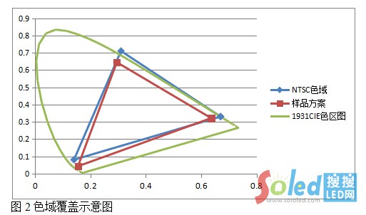 結(jié)合色域覆蓋率的概念,可以推出NTSC色域就是某一RGB三基色坐標(biāo)組成的三角形區(qū)域與NTSC標(biāo)準(zhǔn)RGB三個(gè)色坐標(biāo)組成的三角形區(qū)域的比值(示意圖如圖2),比值越高,色彩的表現(xiàn)力越好。