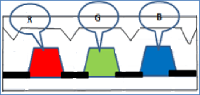CF實(shí)際由R、G、B三種濾光片組成(其平面圖如3示,剖面圖如4示),只有與濾光片光譜相近的光才能更好的透過濾光片,當(dāng)某一光譜經(jīng)過CF的R、G、B濾光片后會(huì)得到一個(gè)新的光譜(此轉(zhuǎn)化示意圖見圖5),將此光譜按R、G、B進(jìn)行分解則得到3個(gè)獨(dú)立的R、G、B光譜。
