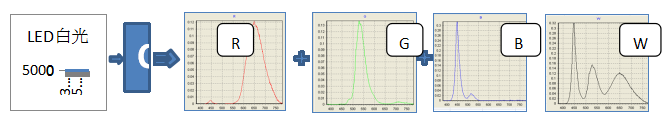 LED白光經(jīng)過CF后得到另一個(gè)新的白光光譜,此新的白光實(shí)際是由3個(gè)獨(dú)立R、G、B光譜構(gòu)成,詳細(xì)的過程如下圖: