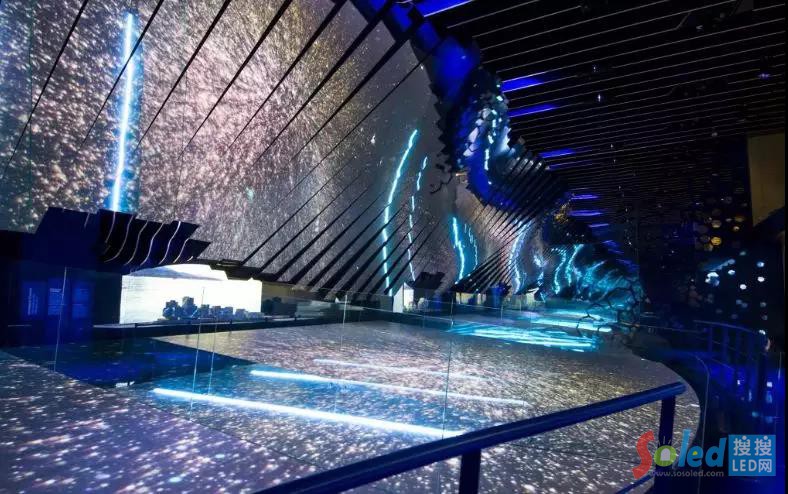 展館中央的這個(gè)巨型動(dòng)態(tài)鏡面裝置,重量為6噸,立面的部分是由36個(gè)動(dòng)態(tài)鏡面葉片組成,地面是LED超大屏,通過(guò)反射原理,將地面屏幕中的內(nèi)容反射到鏡面上,這可以實(shí)現(xiàn)像海浪一樣的視覺(jué)效果,將LED屏幕中的內(nèi)容更生動(dòng)立體的展示出來(lái)。