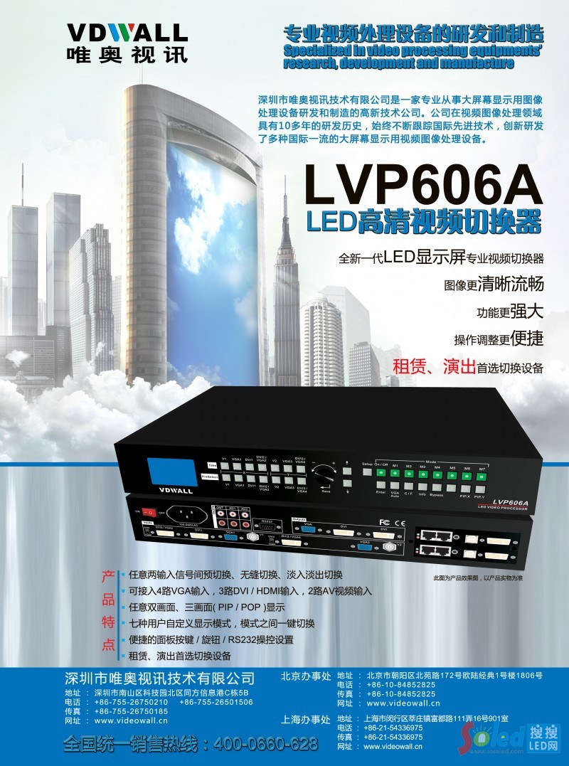 唯奧視訊最新研發(fā)的LVP605系列LED圖像處理器采用最新一代廣播級(jí)視頻處理技術(shù),視頻輸入輸出最大可達(dá)到2304*1152以或者2560*816的全高清分辨率,細(xì)節(jié)更清晰、層次更豐富、色彩更絢麗、場(chǎng)景更生動(dòng),LVP603在此基礎(chǔ)上增加的淡入淡出切換效果和畫中畫、畫外畫、摳像等功能更是滿足了更多應(yīng)用需求。LVS5066 LED高清切換臺(tái)的瞬間無(wú)縫切換、淡入淡出、劃像等切換特技和高清畫中畫、高清字幕圖標(biāo)疊加等功能領(lǐng)先國(guó)內(nèi),完美的視頻顯示效果更是如虎添翼,LVS5066廣泛應(yīng)用于電視演播中心、大型舞臺(tái)劇院、高端會(huì)議和展示展覽等高端應(yīng)用場(chǎng)合。