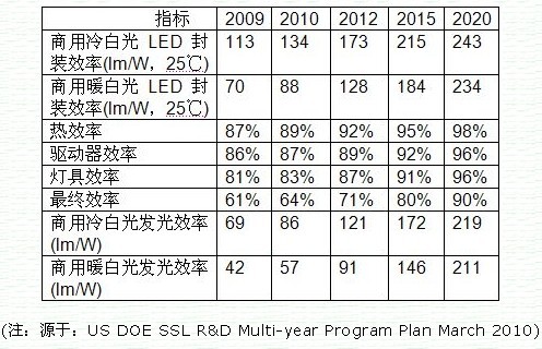 由于白熾燈的發(fā)光效率低,所以世界各國(guó)政府紛紛制定了如圖1所示淘汰白熾燈的時(shí)刻表,而LED的發(fā)光效率高和工作壽命長(zhǎng)的一系列優(yōu)點(diǎn)使LED照明得到了廣泛的應(yīng)用,LED的性能和發(fā)光效率不斷提升,LED有關(guān)技術(shù)指標(biāo)進(jìn)展預(yù)測(cè)如表1所示。