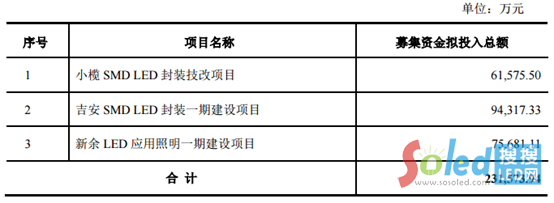公告顯示,木林森本次非公開發(fā)行扣除發(fā)行費用后的募集資金凈額不超過231,573.94萬元,募集資金將全部用于小欖SMD LED封裝技改目、吉安SMD LED封裝一期建設(shè)、新余LED應(yīng)用照明一期建設(shè)三大項目,分別擬投入總額61,575.50萬元、94,317.33萬元、75,681.11萬元。