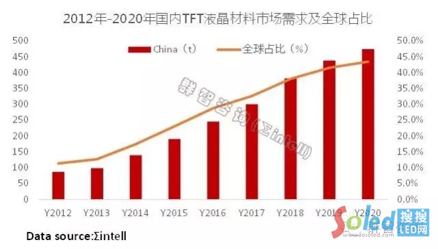 根據(jù)群智咨詢(Σintell)統(tǒng)計數(shù)據(jù)顯示,2015年國內(nèi)TFT液晶材料市場約190噸。