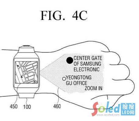 專利顯示當我們戴上智能手表時,手表一側會將屏幕畫面投射到手背或者手臂上,和一些頭戴虛擬現(xiàn)實設備類似,你同樣能夠將畫面投射到墻面上。從專利草圖上可以看出三星手表能夠將撥號盤、地圖以及菜單欄等投射到手上放大顯示,另一方面也可以在投射的皮膚上實現(xiàn)操作。