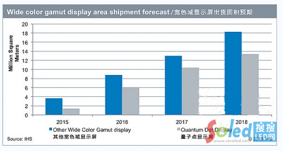 市場(chǎng)調(diào)研機(jī)構(gòu)IHS公司最新研究指出,預(yù)計(jì)到2018年,寬色域(WCG)顯示屏出貨面積將達(dá)到3200萬(wàn)平方米,占到整體顯示屏出貨面積的17%。寬色域顯示屏包括OLED和量子點(diǎn)技術(shù)。