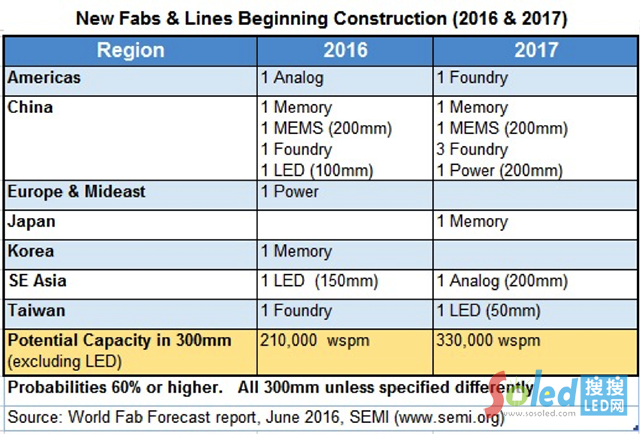 SEMI報告指出,2016至2017年間,確定新建的晶圓廠就有19座,其中,12寸(300mm)晶圓廠就占了十二座,8寸(200mm)晶圓廠四座,6寸(150mm)以下的LED廠也有三座,不含LED廠,其他十六座8寸與12寸晶圓廠今年開始興建的廠房與生產(chǎn)線,以約當(dāng)12寸晶圓來看,裝機產(chǎn)能可達到平均每月21萬片,2017年始建的晶圓廠,以約當(dāng)12寸晶圓來看,裝機產(chǎn)能來到每月33萬片。