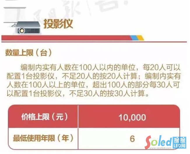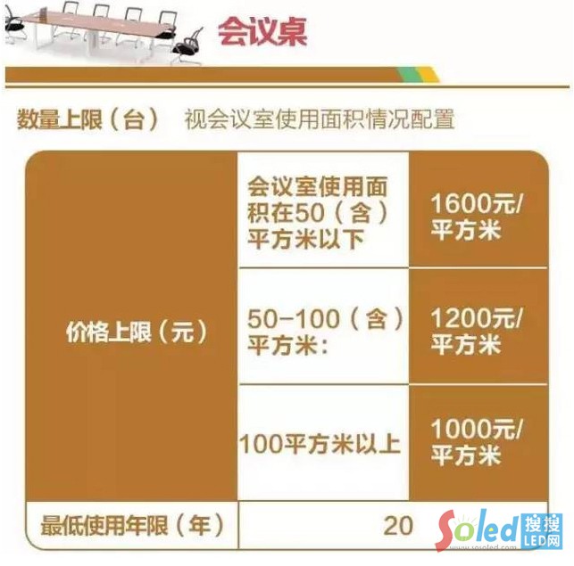 如廳級機(jī)關(guān),使用面積50~100㎡的會議室可配置1套最高80000元的會議室音響設(shè)備等。會議室音響設(shè)備須至少使用13年,投影儀、電視機(jī)、攝像機(jī)、單反相機(jī)等須最少使用8年,其余的辦公自動化設(shè)備均須使用6年以上。