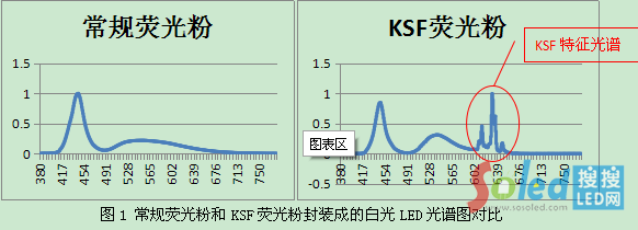 我們先來說說什么是KSF。KSF是化學(xué)式K2SiF6:Mn4+的縮寫,中文可以稱為(含四價(jià)錳離子的)氟硅酸鉀,封裝行業(yè)上也經(jīng)常把它稱之為氟化物熒光粉。嚴(yán)格意義上來說,KSF是指包含A2(MF6):Mn4+結(jié)構(gòu)式配方的一個類型的化合物,其中A是Li, Na, K, Rb, Cs, NH4的一種,而M是的Ge, Si, Sn, Ti, Zr元素的一種,或者是元素組合。KSF熒光粉是一種紅色熒光粉,它的主要特征是發(fā)射光譜的半波寬非常窄,而且能量很高。圖1是常規(guī)熒光粉LED封裝光譜和KSF熒光粉LED封裝光譜的對比圖。