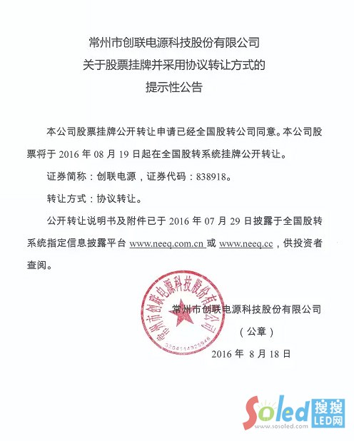 常州市創(chuàng)聯(lián)電源科技股份有限公司在全國(guó)中小企業(yè)股份轉(zhuǎn)讓系統(tǒng)(新三板)掛牌上市,正式進(jìn)入資本市場(chǎng),股票簡(jiǎn)稱(chēng):創(chuàng)聯(lián)電源、股票代碼838918。