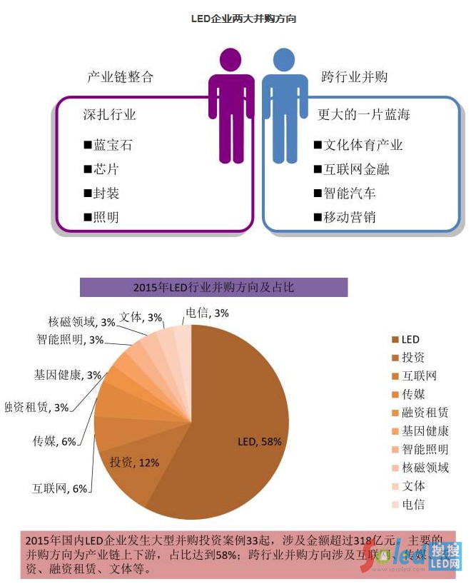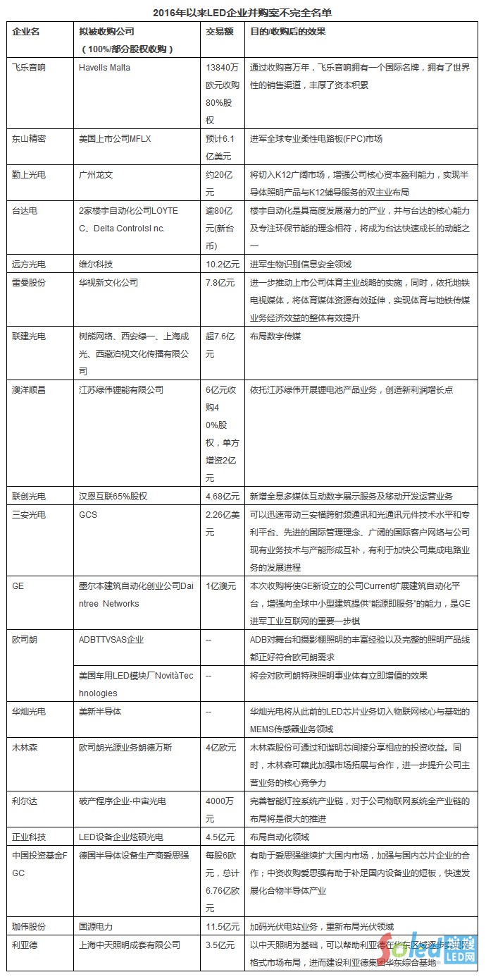 今年上半年,LED行業(yè)并購化進(jìn)程進(jìn)一步提速。以并購為主的發(fā)展模式成為LED企業(yè)謀求海外市場、跨界轉(zhuǎn)型的捷徑。在LED行業(yè),動則億級的并購案時有發(fā)生,LED企業(yè)的并購方向也是多種多樣,且來看一下。
