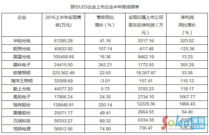 從目前已公布的LED上市公司半年報來看,2016年上半年企業(yè)營業(yè)收入除海洋王照明同比有小幅下滑外,都實(shí)現(xiàn)了不同程度的增長,晶科電子、珈偉股份營收漲幅甚至達(dá)到了百分之二百以上,而凈利潤方面,則除了乾照光電有所下降外,均有所增長。其中,珈偉股份和奧拓電子漲幅尺度最大,凈利增幅超16倍以上。