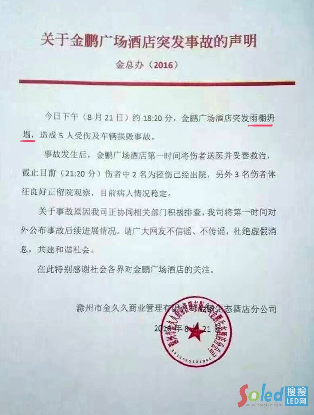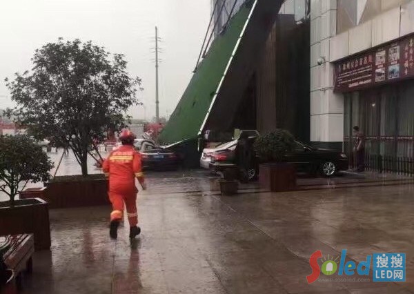 事故發(fā)生當天,酒店發(fā)出公告,聲明坍塌的是酒店大門口的雨棚。劇了解酒店大門口雨棚前端有塊小型的LED單雙色門頭屏。導致事故的雨棚的鋼結構,而非新聞報道的LED大屏掉落。