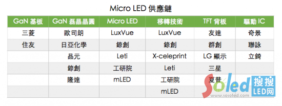 在這場(chǎng)Micro LED領(lǐng)域的誰(shuí)與爭(zhēng)鋒中,中國(guó)臺(tái)灣地區(qū)不少大廠也已投入技術(shù)研發(fā),包括半導(dǎo)體新創(chuàng)公司錼創(chuàng)(PlayNitride)、臺(tái)工研院、友達(dá)、群創(chuàng)、晶電。其他也在Micro LED爭(zhēng)戰(zhàn)行列的國(guó)際大廠包括Sony、三星、樂(lè)金、日亞化學(xué)、夏普等,而從英國(guó)史崔克萊大學(xué)(University of Strathclyde)拆分出來(lái)的公司 mLED、美國(guó)德州理工大學(xué)(Texas Tech University)、法國(guó)原子能署電子暨資訊技術(shù)實(shí)驗(yàn)室(Leti)、從伊利諾大學(xué)(University of Illinois)分拆出來(lái)的X-celeprint也都積極研發(fā)Micro LED技術(shù)。