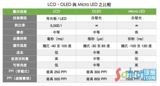 承繼了LED的特性, Micro LED優(yōu)點(diǎn)包括低功耗、高亮度、超高解析度與色彩飽和度、反應(yīng)速度快、超省電、壽命較長(zhǎng)、效率較高等,其功率消耗量約為L(zhǎng)CD的10%、OLED的50%。而與同樣是自發(fā)光顯示的 OLED 相較之下,亮度比其高30倍,且解析度可達(dá)1500PPI(像素密度),相當(dāng)于Apple Watch采用OLED面板達(dá)到300PPI的5倍之多,另外,具有較佳的材料穩(wěn)定性與無(wú)影像烙印也是優(yōu)勢(shì)之一。