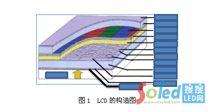 以TFT類型的液晶顯示屏為例,其構造中主要包含背光源、導光板、上下偏振片、液晶、彩色濾光片、薄膜晶體管等(構造示意圖見圖1),主要構造的作用說明如下: