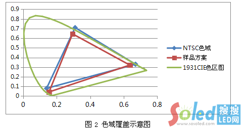 結合色域覆蓋率的概念,可以推出NTSC色域就是某一RGB三基色坐標組成的三角形區(qū)域與NTSC標準RGB三個色坐標組成的三角形區(qū)域的比值(示意圖如圖2),比值越高,色彩的表現(xiàn)力越好。