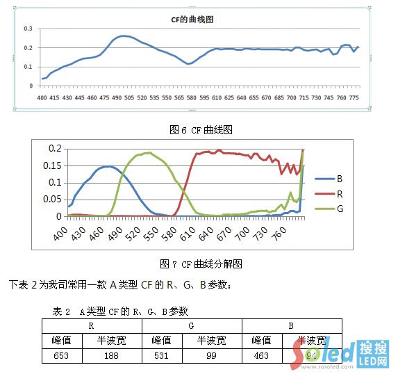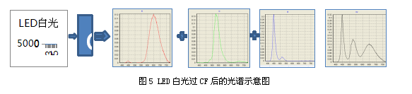 LED白光經(jīng)過CF后得到另一個新的白光光譜,此新的白光實際是由3個獨立R、G、B光譜構成,詳細的過程如下圖: