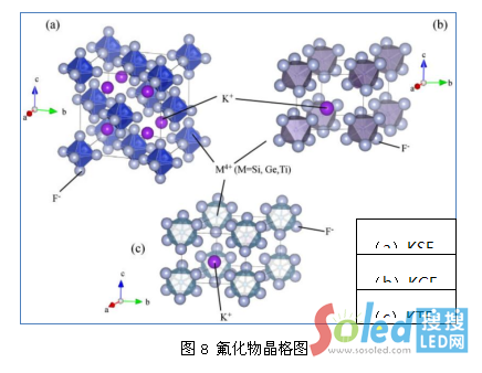 氟化物是4價錳激發(fā)的氟硅酸鹽,其分子式為 AxMFy:Mn4+(其中A=Li,Na,K,Ca,Sr,Ba等,M=Si,Al,Y,Sc等)。常用的氟化物熒光粉一般包含KSF、KGF、KTF三種體系,其中KSF屬于立方晶系,晶格圖如圖8中,KGF、KTF屬于六方晶系(晶格圖如下圖8),中文名稱為:4價錳激發(fā)的氟硅酸鉀/鍺/鈦,其化學式分別為K2SiF6:Mn4+、K2GeF6:Mn4+、K2TiF6:Mn4+,化學式與硅酸鹽類似(硅酸鹽化學式:XSiO2)。
